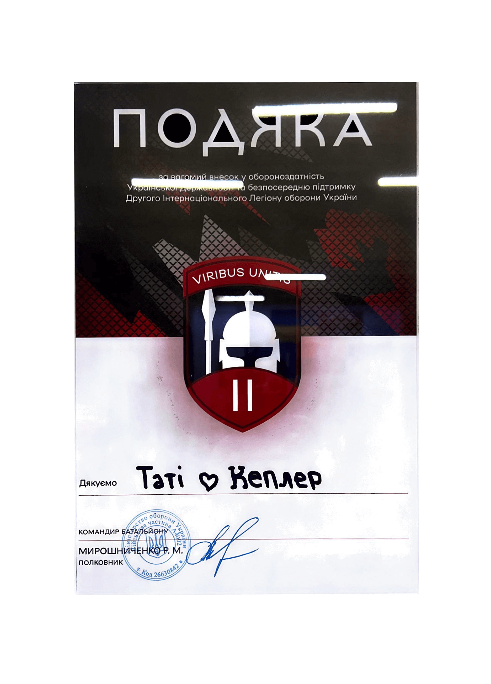 Вдячність від 2-го Інтернаціонального Легіону оборони України