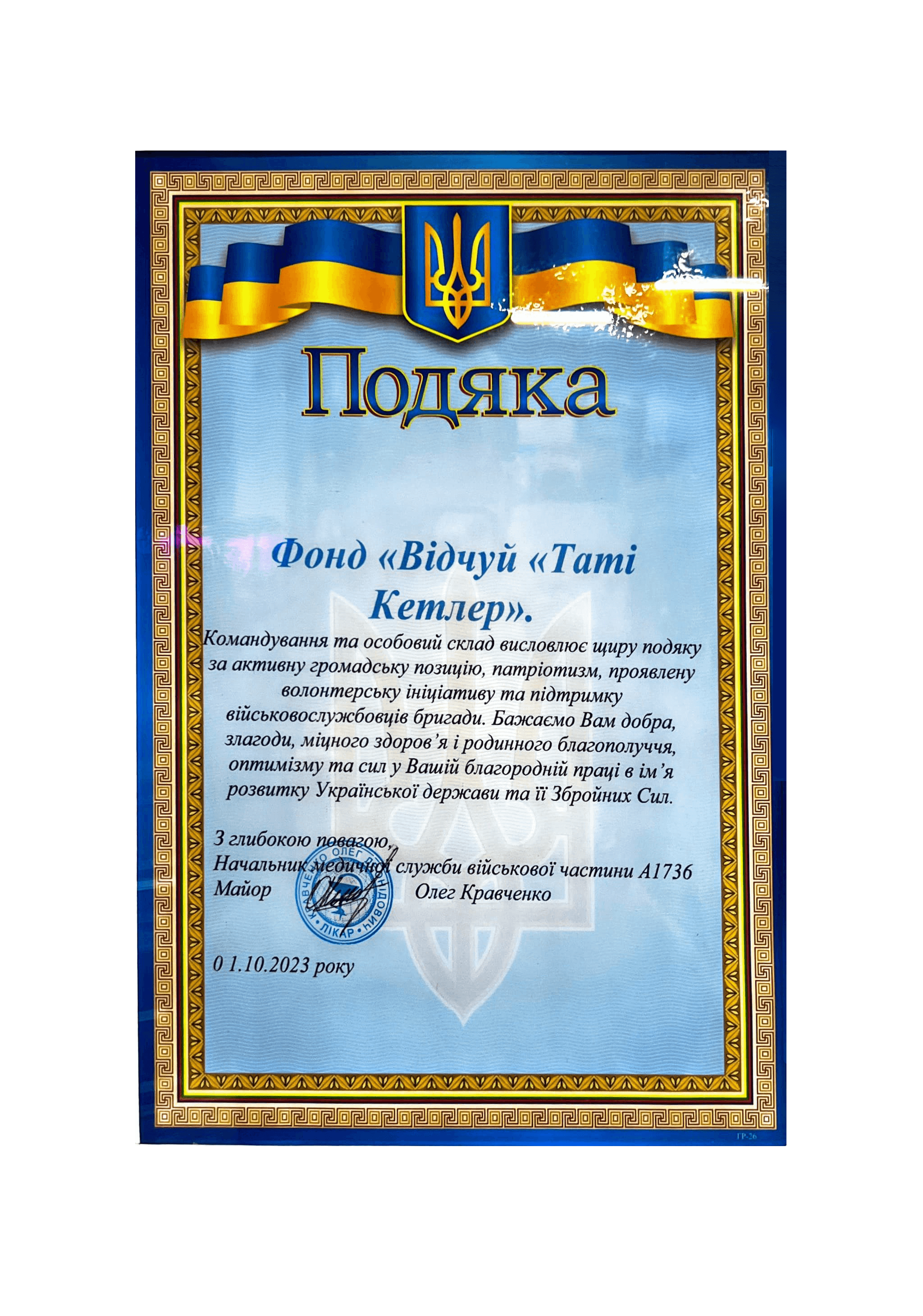 Вдячність від Командування Медичних сил Збройних Сил України